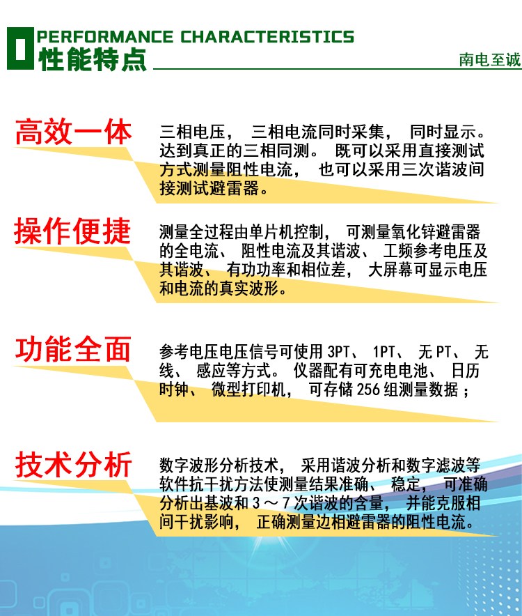 仪器操作简单、使用方便,测量全过程由单片机控制,可测量氧化锌避雷器的全电流、阻性电流及其谐波、工频参考电压及其谐波、有功功率和相位差,大屏幕可显示电压和电流的真实波形。仪器运用数字波形分析技术,采用谐波分析和数字滤波等软件抗干扰方法使测量结果准确、稳定,可准确分析出基波和3~7次谐波的含量,并能克服相间干扰影响,正确测量边相避雷器的阻性电流。本机配有高速面板式打印机,可充电电池,试验人员在现场使用十分方便。仪器采用独特的高速磁隔离数字传感器直接采集输入的电压、电流信号,保证了数据的可靠性和安全性。