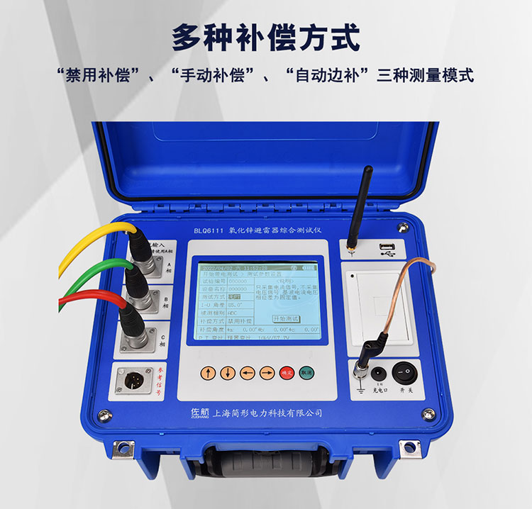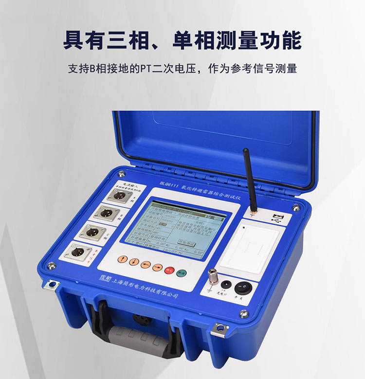 5 可同时测量三相氧化锌避雷器的电气参数,并可自动补偿相间干扰;也可单相测量,支持B相接地的PT二次电压作为参考电压;当被测相与参考电压相别不同时,可自动计算补偿角度。