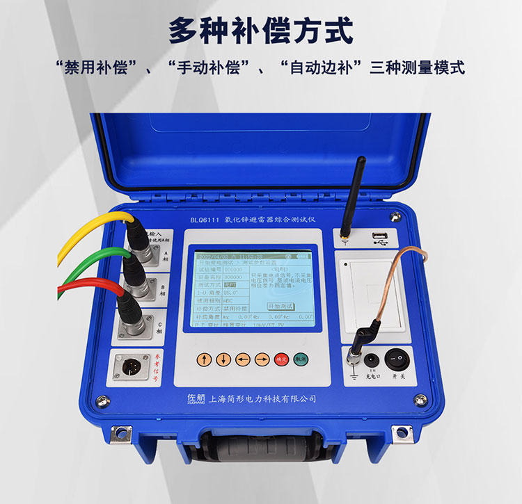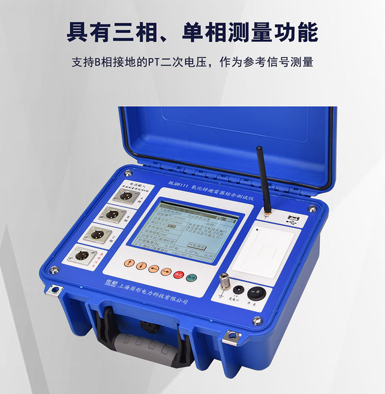 5 可同时测量三相氧化锌避雷器的电气参数,并可自动补偿相间干扰;也可单相测量,支持B相接地的PT二次电压作为参考电压;当被测相与参考电压相别不同时,可自动计算补偿角度。