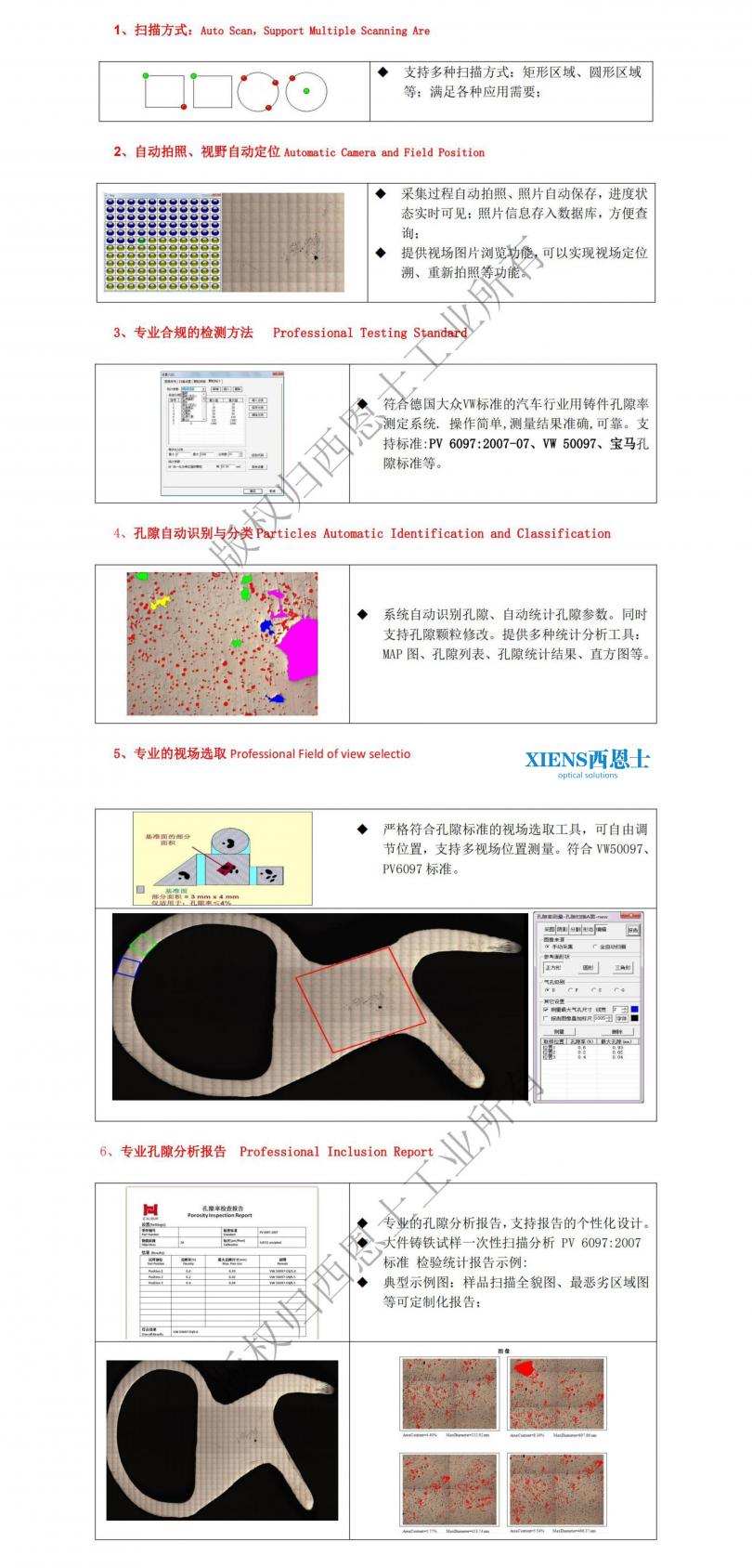 AP53M孔隙率系统依然是基于高性能光学显微镜打造的全自动的分析解决方案,主要用于分析铝合金和铸铁等铸件的铸造孔隙分析。同时也适用于其他材料的孔隙分析。全自动的检验分析过程:自动扫描整个试样、自动拍照,孔隙自动识别、统计、分析,自动孔隙分析、自动生成专业分析报告;符合德国大众VW标准的汽车行业用孔隙率测定系统. 操作简单,测量结果准确, 可靠。支持PV 6097:2007、VW 50097等标准,并支持企业自定义标准。