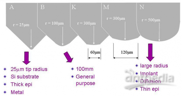 · 可供选择的探头类型:根据测试不同工艺要求有A, B,K, M, N等相关型号探头选择,另外还可提供专门为客户定制的应用特殊要求的探针,比如测试薄至30A的薄膜时需要使用MR型探头,这是四探针设备供应商少有能做到的。