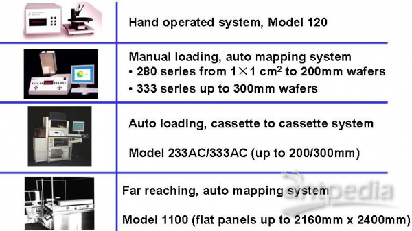 · 测量尺寸:晶圆尺寸:2-8寸(333系列可测量大至12寸晶圆,1100系列可测量大至2160mmX2400mm平板系列)