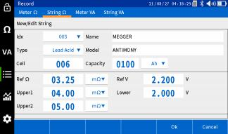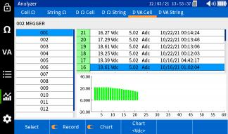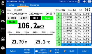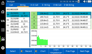 BITE5 将测量电池阻抗、电池电压和温度。装置触摸屏 上可显示记录数据的趋势分析。查看每次测试的数据趋势分析或每个电池的数据趋势分析。设置电压和阻抗 的通过、警告和失败限制。记录纹波电压、纹波电流和浮充电流,并通过 USB 或 SD 卡将记录的数据传输到 PowerDB 软件,然后创建自定义报告和自动分析。