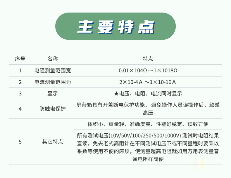本仪器主要用于测试绝缘材料的绝缘电阻、体积电阻及表面电阻值,本仪器是一台通用试验仪器,通过选配不同的测试电极,可以满足和测试所有不同类型的绝缘材料,如:粉末、片材、薄膜和液体溶液等。本仪器测试量程比较款,可以到1018Ω,几乎可以满足于市场上所有的绝缘材料的测试。