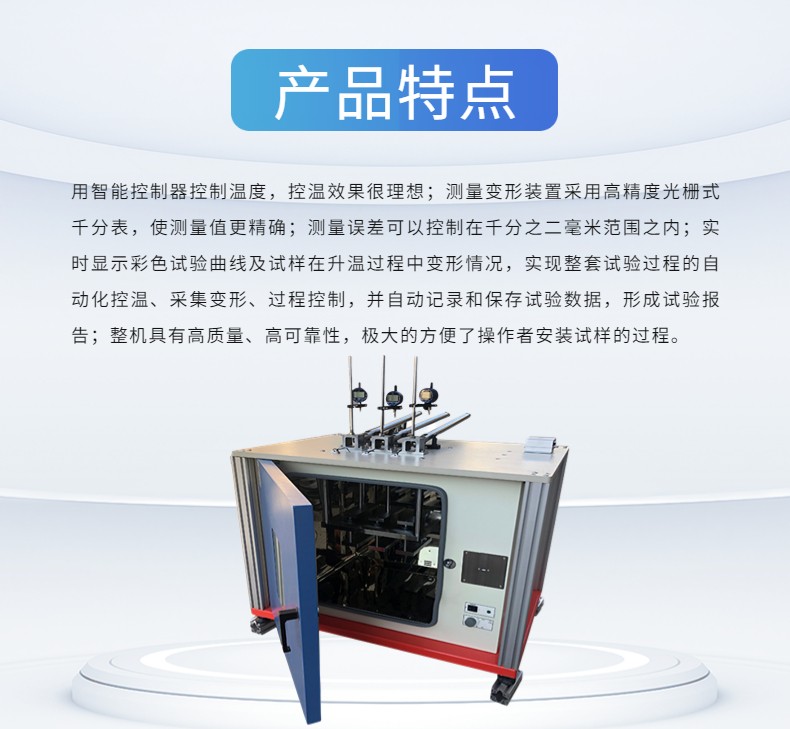 该机用于测定硬质泡沫在高温空气状态下的屈服压缩/弯曲特性,是目前国内一款能够测试硬质泡沫热压缩/弯曲变形特性的测试设备;符合标准DIN-53424、GBT 20672-2006。本设备用智能控制器控制温度,控温效果很理想;测量变形装置采用高精度光栅式千分表,使测量值更精确;测量误差可以控制在千分之二毫米范围之内;实时显示彩色试验曲线及试样在升温过程中变形情况,实现整套试验过程的自动化控温、采集变形、过程控制,并自动记录和保存试验数据,形成试验报告;整机具有高质量、高可靠性,极大的方便了操作者安装试样的过程。