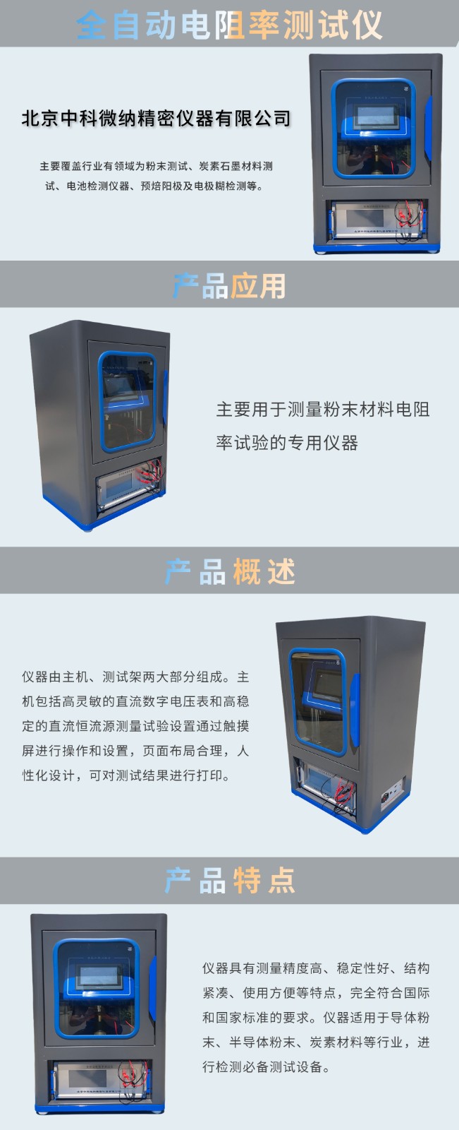 试验设置通过触摸屏进行操作和设置,页面布局合理,人性化设计,可对测试结果进行打印。仪器具有测量精度高、稳定性好、结构紧凑、使用方便等特点,符合国际和国家标准的要求。仪器适用于导体粉末、半导体粉末、炭素材料等行业,进行检测测试设备。
