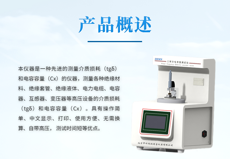 本仪器是一种先进的测量介质损耗(tgδ)和电容容量(Cx)的仪器,测量各种绝缘材料、绝缘套管、绝缘液体、电力电缆、电容器、互感器、变压器等高压设备的介质损耗(tgδ)和电容容量(Cx)。具有操作简单、中文显示、打印、使用方便、无需换算、自带高压,抗干扰能力强, 测试时间短等优点。