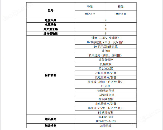 4 路交流电流、3 路交流电压通道;8 路开关量输入通道(交直流两用)、5 路开关量输出通道;1 个 RS485 通讯接口。