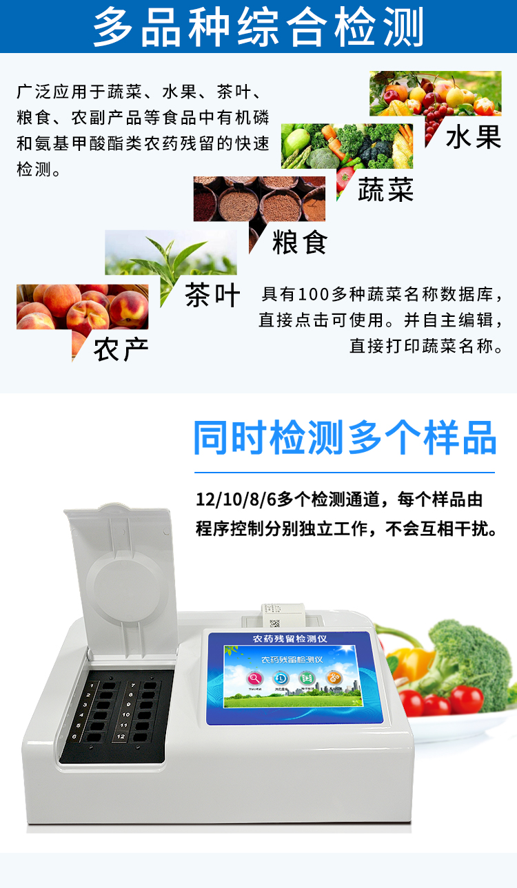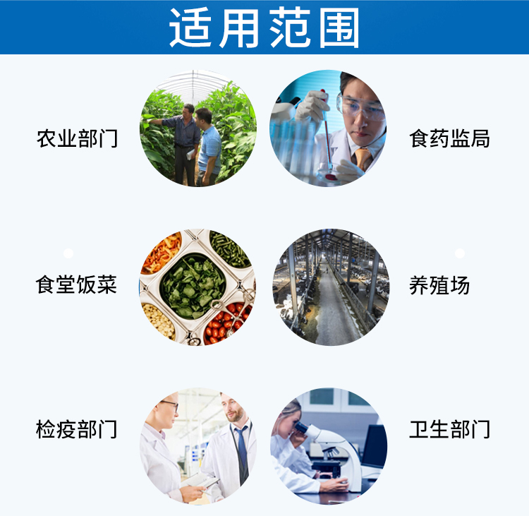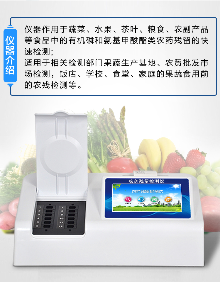 广泛应用于主要用于蔬菜、水果、茶叶、粮食、农副产品等食品中有机磷和氨基甲酸酯类农药残留的快速检测;此外还可用于果蔬茶生产基地和农贸批发销售市场现场检测,餐馆、学校、食堂、家庭果蔬加工前的速测等。