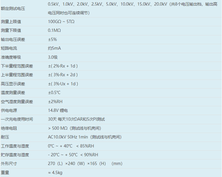 >有0.5kV、1.0kV、2.0kV、2.5kV、5.0kV、10.0kV、15.0kV、20.0kV共8个电压输出档。