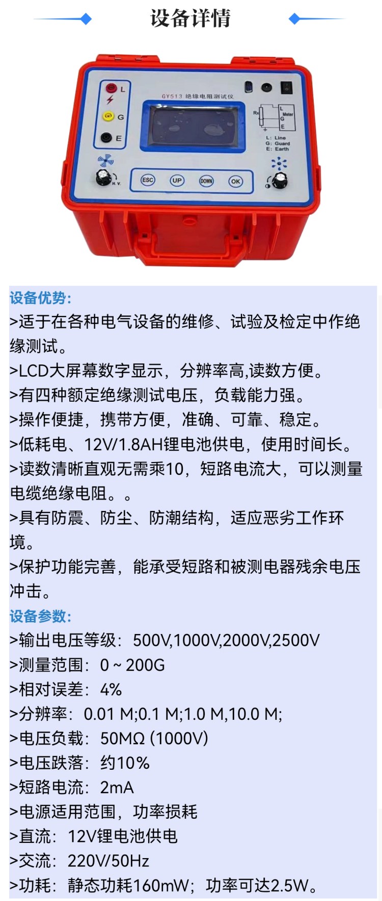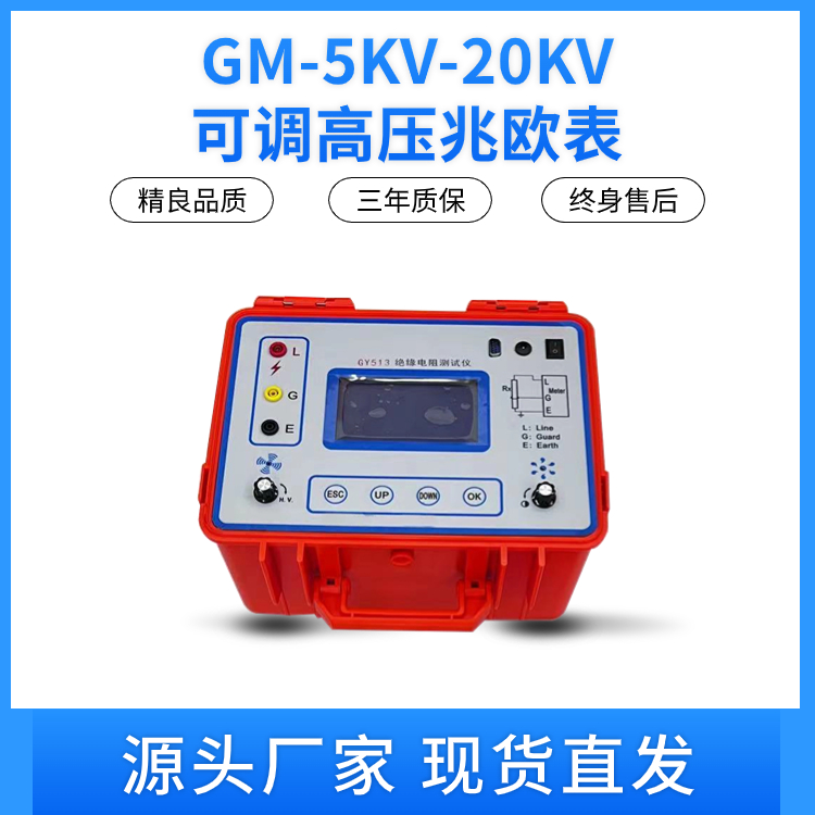 GM-5KV/10KV/15KV/20KV系列可调高压数字兆欧表测试电压高,功率大,被测量对象往往又带有工频泄漏或感应上高压干扰电能,因此为了人身安全,使用该仪器首先一定要接好安全接地线。可调高压数字兆欧表是为了解决高压变电站、发电厂现场强干扰下对大型高压变压器、电机电器、远程电力电缆或埋设电缆等电气绝缘电阻特性的测试而设计研制。它亦可用于广泛领域的电气绝缘电阻特性测量。