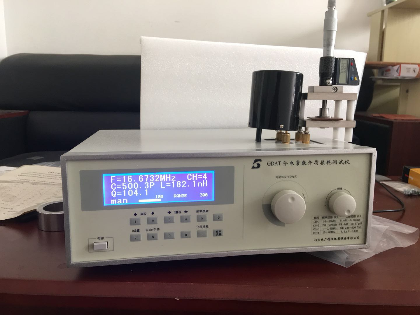技术参数显示器:480×RGB×272,4.3寸TFT LCD显示器。测试信号频率:20Hz—1MHz分辨率:10mHz,4位频率输入准确度:0.01%AC电平测试信号电压范围:10mV—2Vrms电压分辨率:100μV,3位输入准确度ALC ON 10% x设定电压 + 2mVALC OFF 6% x设定电压 + 2mV测试信号电流范围:100μA—20mA电流分辨率:1μA,3位输入测试原理采用高频谐振法,并提供了,通用、多用途、多量程的阻抗测试。它以单片计算机作为仪器的控制,测量核心采用了频率数字锁定,标准频率测试点自动设定,谐振点自动搜索,Q值量程自动转换,数值显示等新技术,改进了调谐回路,使得调谐测试回路的残余电感减至低,并保留了原Q表中自动稳幅等技术,使得新仪器在使用时更为方便,测量值更为精确。仪器能在较高的测试频率条件下,测量高频电感或谐振回路的Q值,电感器的电感量和分布电容量,电容器的电容量和损耗角正切值,电工材料的高频介质损耗,高频回路有效并联及串联电阻,传输线的特性阻抗等。本测试装置是由二只测微电容器组成,平板电容器一般用来夹持被测样品,园筒电容器是一只分辨率高达0.0033pF的线性可变电容器,配用仪器作为指示仪器,绝缘材料的损耗角正切值是通过被测样品放进平板电容器和不放进样品的Q值变化,由园筒电容器的刻度读值变化值而换算得到的。同时,由平板电容器的刻度读值变化而换算得到介电常数。